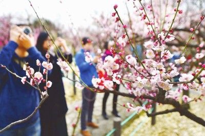 近日,上海天气回暖,不少市民外出踏青赏花。在上海植物园的梅园里,盛开的腊梅芳香馥郁,吸引大批市民和游客闻香而来、驻足观赏,感受早春的烂漫生机。据了解,上海植物园植有400余株共50多个品种的梅花。有鲜艳夺目的大杯梅、照水朱砂梅,也有花色明丽的南京红等宫粉品种,繁花玉蝶、玉蝶龙游等复瓣品种的梅花则粉嫩娇柔,颇具江南女子的柔美。